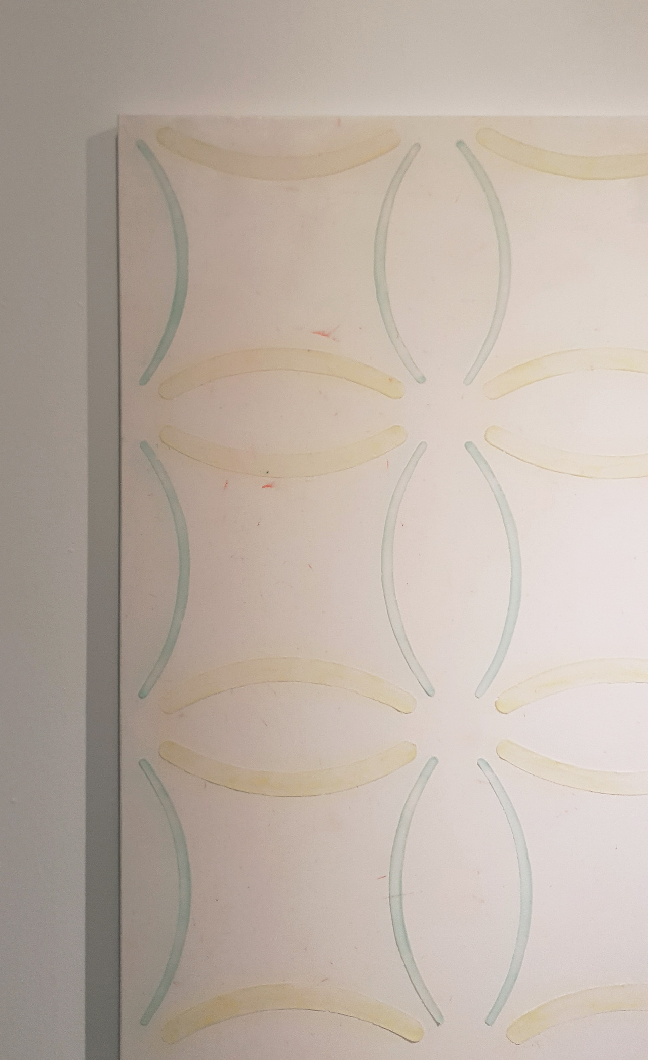 회화 작품 <여리여리한 뼈대>의 바탕은 노란색이나 분홍색 혹은 하늘색에 가까운 미색으로 채워져 있다. 페인팅의 표면은 독특하다. 작품의 재료가 되는 밀랍은 건조한 무광의 질감을 만들어내고, 물감 안료와 섞여 작품에 섬세하게 색을 더한다. 이들은 균질하지 않게 퍼져있다. 언뜻 보면 안개가 캔버스 주위를 둘러싼 것처럼, 희미한 질감과 색감의 차이가 곳곳에서 느껴진다. 멀리서 보면 차이를 느낄 수 없을지도 모르지만 가까이에서 작품을 관찰한다면 같은 색이라도 부분마다 채도와 명도가 미묘하게 다르다는 것을 알 수 있다. 구름이 뜬 하늘처럼, 아니면 당황해서 붉어진 두 뺨처럼 색은 어느 곳에 뭉쳤다가 살짝 자리를 비켜 다시 흩어진다. 재질과 색감에서 미세한 차이를 드러내는 평면은 방해물 없이 미끄러지는 매끈한 표면과는 거리가 있다. 이 그림을 만져본다면 어떨까. 불규칙한 평면은 단지 평면으로 머무르지 않고 예민한 촉감을 상상하게 한다.