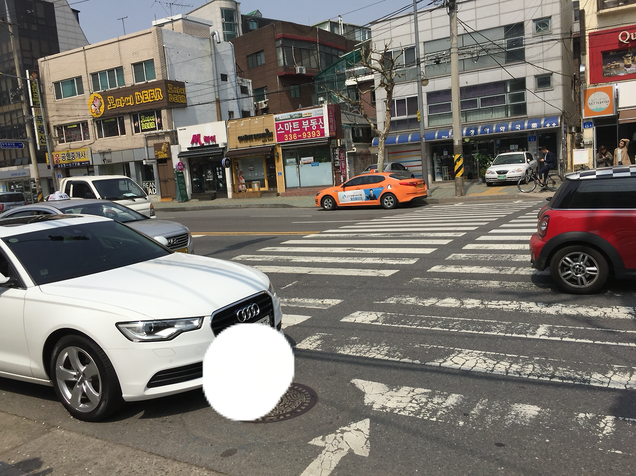 사진 속의 흰색 아우디는 횡단보도의 반을 걸쳐 정차되어 있다. 바로 앞 마트에서 일하는 아저씨가 그 차주에게 부드럽지만 단호하게 횡단보도 앞이니 차를 빼 달라고 말했다. 하지만 운전자는 묵묵부답이다.