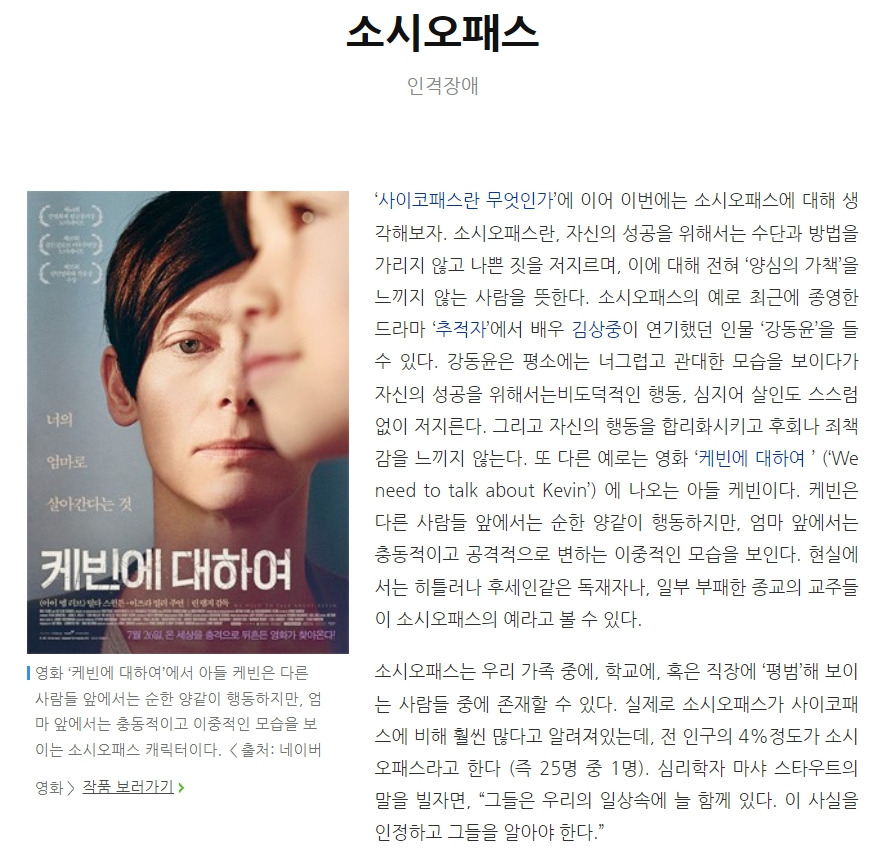 마샤 스타우트의 말처럼 4%의 인원이 언제나 주위에 있을 수 있고, 게다가 그들은 높은 포지션으로 승진할 가능성이 또한 매우 높다는 통계도 있습니다. " 어느 기사에 따르면 대기업 임원 10명 중 6명은 소시오패스적 성향을 가지고 있다고 한다 어쩌면 이것은 현대사 외의 어두운 이면일지도 모른다. - C의 유전자 회사 위에 존재하는 자들의 비밀 "