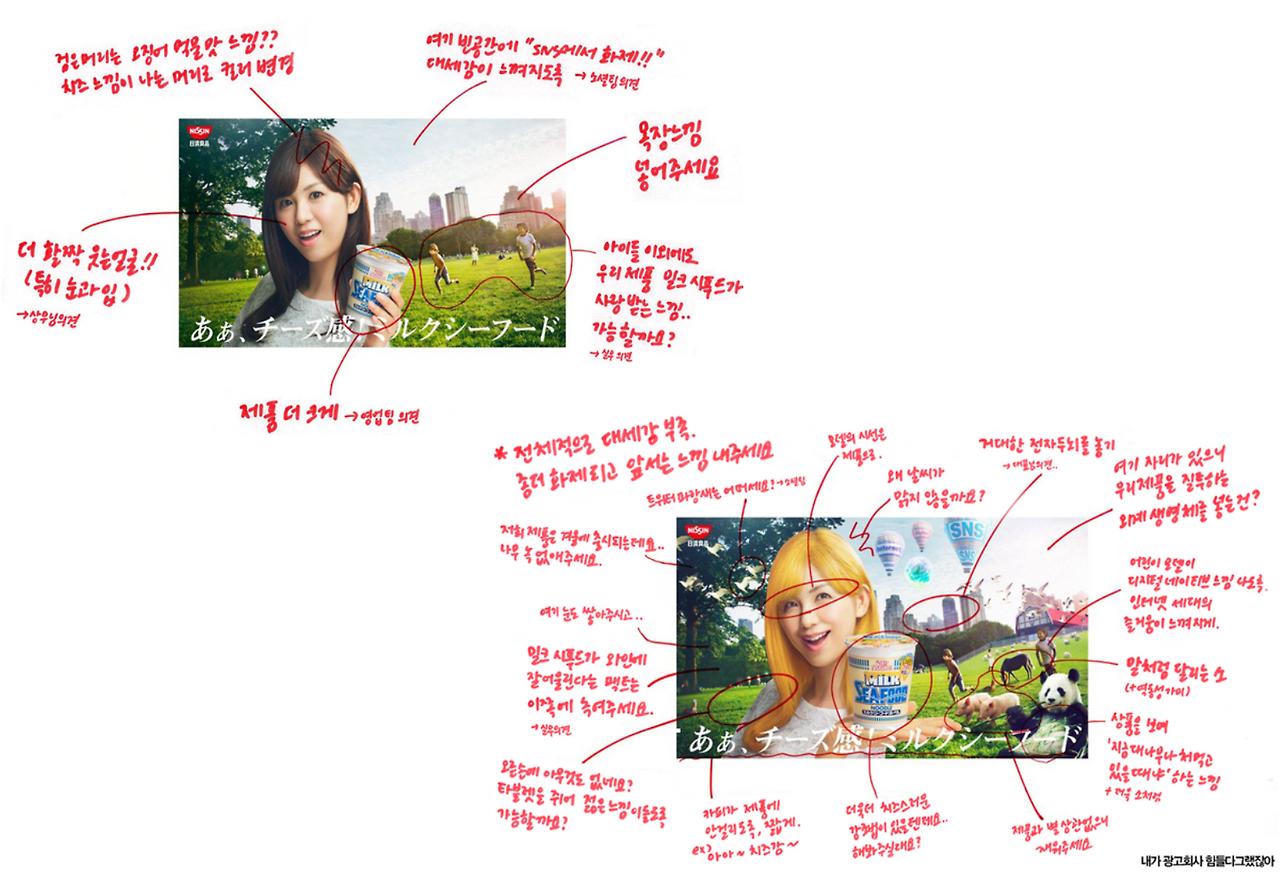 이 니신 컵라면 홍보에서도 이야기하고 있는 부분은, 너무 지나친 간섭과 지시는 업무의 성과를 제한하고 망치게 된다(이상한 광고를 만들게 된다?)라는 관점에서 출발해서 이렇게 황당한 광고물이 나오게 된 배경에 대한 설명을 통해 소비자들에게 새로운 광고를 이슈화해보자는 의도인 것 같습니다. 요즘에는 톱스타가 나오는 멋진 광고보다는 약간 이상하고 촌스러운 B급 광고, 병맛 광고 등이 인기와 관심을 얻는 것과 비슷한 전략인 것 같기도 합니다.