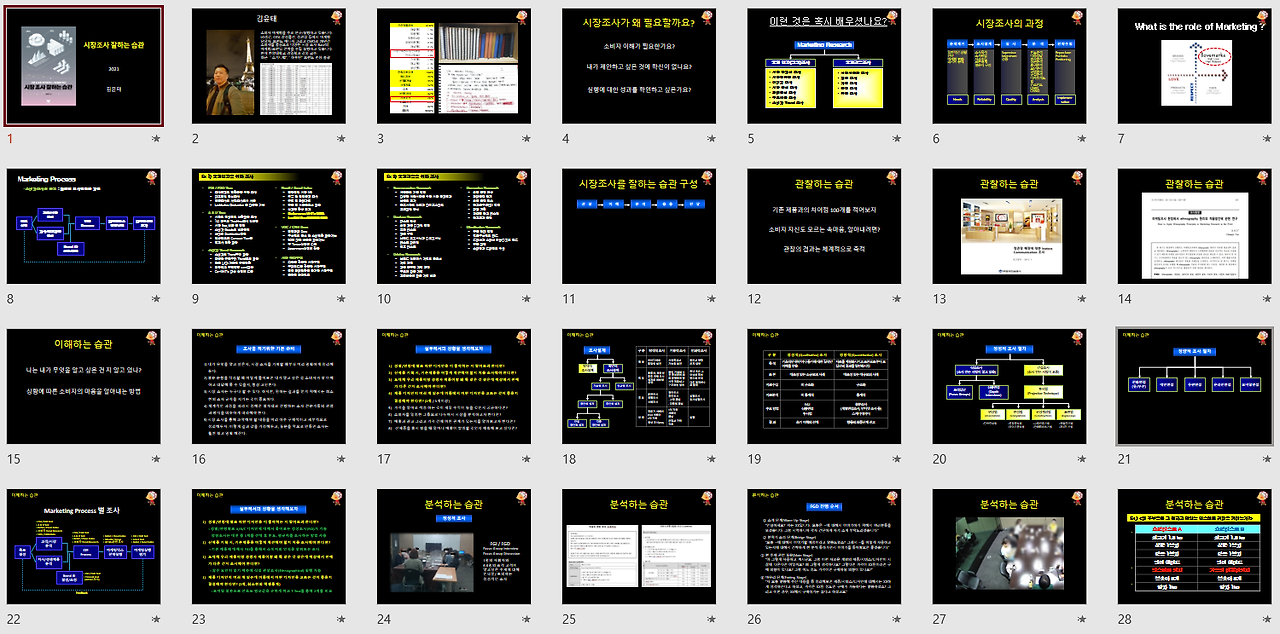 강의는 제가 21년에 쓴 책(시장조사 잘하는 습관)을 중심으로 진행하였지만, 강의자료는 기본적으로 윌라에서 제공되고 있는 오디오북을 만들었던 자료를 바탕으로 추가적인 내용을 넣어서 강의자료를 만들었습니다. 주로 정성조사와 정량조사 최근의 퍼포먼스 마케팅 자료 그리고 모바일 조사와 인터넷조사의 최신 경향 등이 이야기의 주된 내용이었습니다.