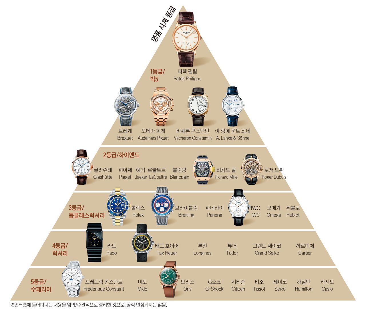여기 이런 예가 있다. 얼마 전 어느 TV프로그램에서 명품에 대한 이야기를 하다가 남성들의 로망 손목시계에 대한 이야기가 나온 적이 있었습니다. 그중 어떤 패널이 요즘 인터넷에 명품시계 계급도가 나와 있다고 해서 보여주는데 흥미로워서 여기 아래에 놓아 보겠습니다.