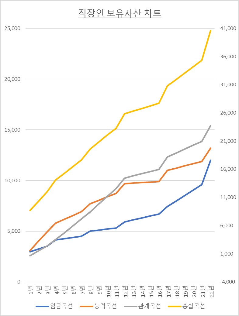 두 번째로는 업무능력자산이다. 업무의 능력은 사원, 대리, 과장을 지나면서 크게 성장하지만 부장과 임원이 되는 순간에는 상대적으로 업무보다는, 직장내의 인간적인 관계와 정치의 영역이 더 큰 영향을 미친다고 판단해서 그래프가 좀 더 완만한 상승을 이루며 임원에 이르고 있다. 이 자산의 가치는 임금과 비교하여 금액으로 환산했고 그것을 기준으로 오렌지색 그래프로 만들어 보았다.