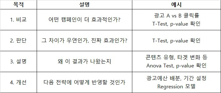 하지만 실무에서는 실제로 학교에서 연구소에서 진행하시는 굉장히 엄격한 가정과 제약조건보다는 오히려 "어떤 지표를 어떻게 비교해야 하고", "실행결과의 차이가 있는지 어떻게 판단할지", "그 차이를 어떻게 마케팅 전략에 반영할지"를 알아야 할 필요가 더 중요합니다.