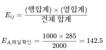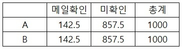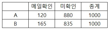 H₀ (귀무가설): 메일 확인 여부는 그룹(A/B)과 독립이다. → 오픈율에 차이가 없다.