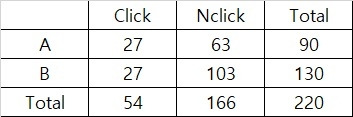 여기에서 기댓값을 계산해야 하는데, A를 클릭할 기댓값은 (해당행의 합 X 해당열의 합)/전체의 합으로 계산하게 된다. 즉 (90X54)/220이 A광고 Click의 기댓값이라고 할 수 있습니다.