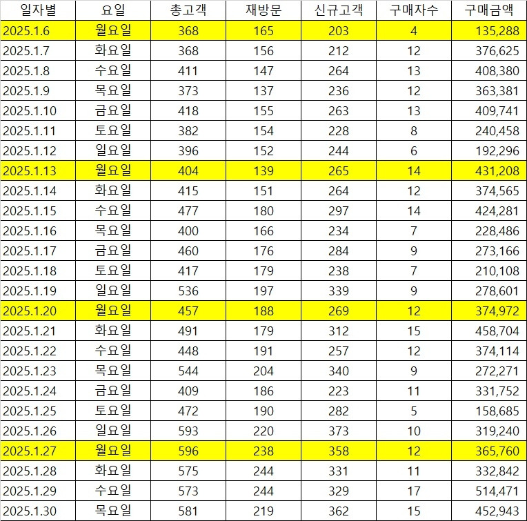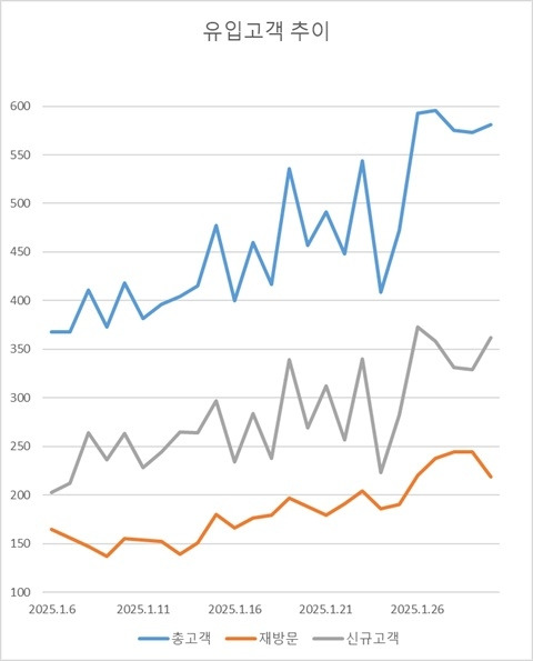 이런 자료를 보시면 어떤 생각이 드실까요? 전체적으로는 재방문 고객이 늘어나고 있고 신규고객도 잘 들어오고 있어서 긍정적인 그래프로 보이실 것 같습니다.