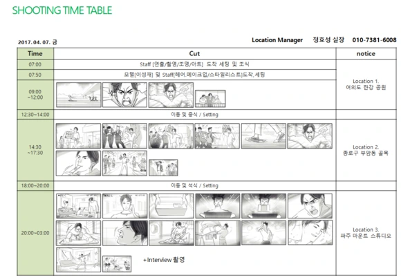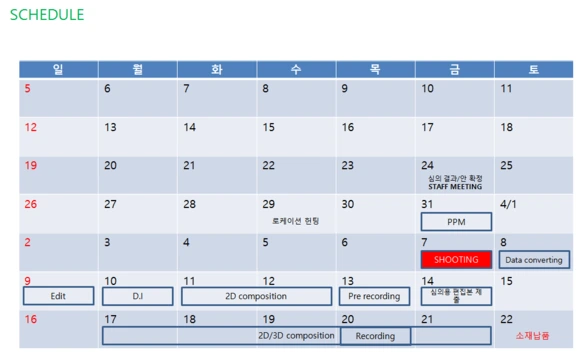 그 중에서도 PPM(Pre Production Meeting)은 광고의 콘티가 거의 완성된 후 광고를 제작하기 전에 광고주와 제작사가 하는 미팅으로 모델, 촬영지, 동선, 스튜디오, 의상, 엑스트라 등에 대한 최종적인 의견을 나누는 자리라고 할 수 있습니다.