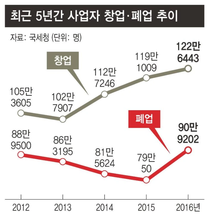 2015년 창업한 개인사업자는 119만1009명이다. 2015년에 하루 평균 3000명이 자영업체를 새로 차린 셈이다. 반면 같은 해 기준 폐업한 개인사업자는 73만5000명으로, 매일 2000명꼴로 사업을 접은 것으로 나타났다. 창업과 폐업을 단순 비교한 자영업 생존율은 38.3%에 미쳤다.