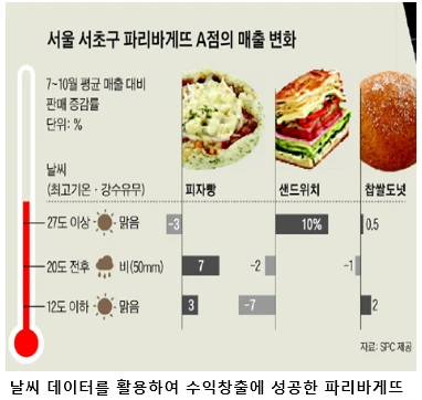 이익을 추구하는 기업에게 있어서 빅데이터는 이익을 극대화 시켜주는 고마운 존재이다. '날씨에 따라 고객의 입맛이 변화한다'는 사실을 이용하여 국내 대표 베이커리 전문 매장인 파리바게뜨는 5년간 169개 지역의 일별 매출과 기상자료를 통계기법으로 지수화한 '날씨 판매지수'를 활용하여 2012년 6월부터 날씨 경영 마케팅을 실시하였다. 이 덕분에 파리바게뜨는 판매량을 예측하고 주문량을 조절할 수 있어 찬스로스 (Chance Loss, 판매할 제품이 없어 발생하는 손실)를 방지하고 재고 부담을 줄임으로써 영업이익이 증가하였다.