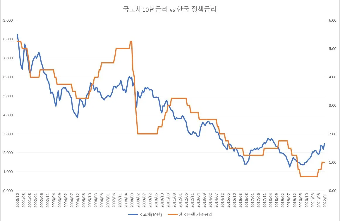 3. 한국 국채 10년 물 금리와 미국 국채 10년 물 금리는 상당히 비슷하게 움직이는 것을 확인할 수 있다. 결론적으로 한국 국채 금리에 가장 영향을 주는 요소는 미국 국채 금리라고 할 수 있겠다!