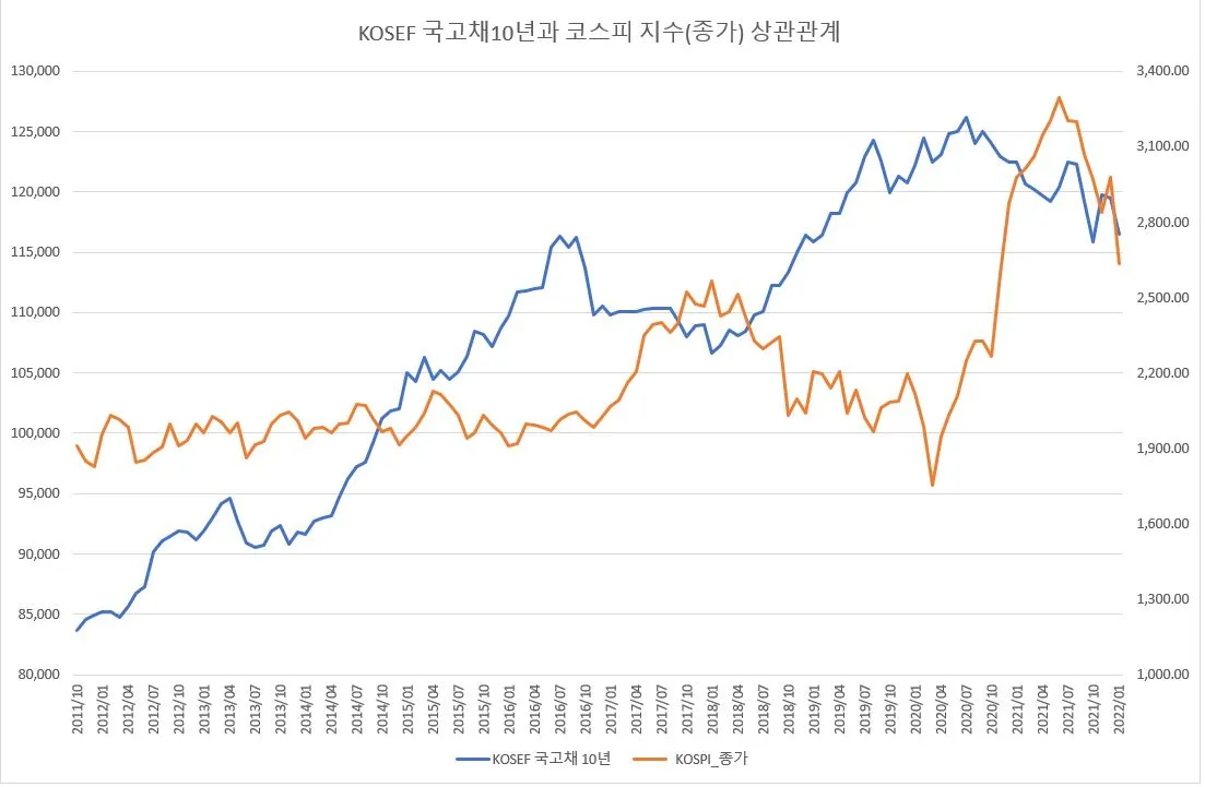1. 한국 국채 10년 물 국채 가격과 코스피는 기본적으로 반대로 움직이는 경향이 있으나, 상관관계의 강도가 약하다.