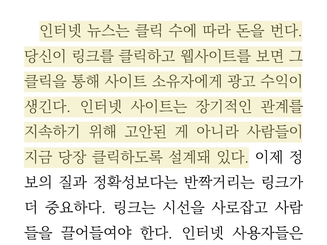 그림에서 자세한 설명을 한다. 요컨대, 인터넷 뉴스는 클릭 수에 따라 광고 수익을 얻을 수 있다는 점이다. 자본주의 시대에서 정보를 생산하는 대신 돈으로 보상을 받는 구조가 인터넷 뉴스에도 그대로 적용되는 것이다.