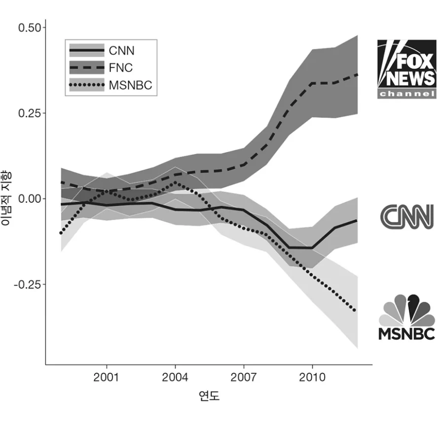 둘째, 당파성이 강조한다. 소셜미디어는 당파성이 강한 내용이 많다. 그림 2는 미국의 주류 언론의 녹취록을 토대로 당파적 경향을 분석한 그래프이다. 주류 언론조차 사실보다 당파적 입장을 내보인다는 것을 확인할 수 있다. 그 이유는 당파적 이념 분열을 심화하는 것이 클릭수를 올려 결과적으로 수익성으로 이어지기 때문이다.