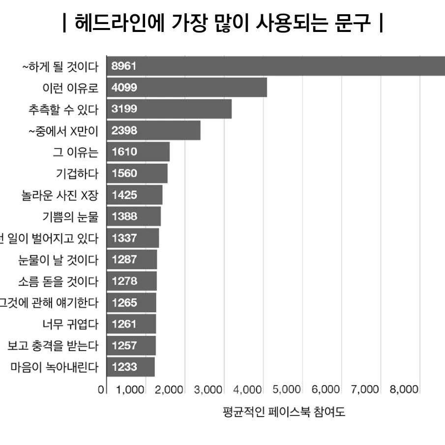 첫째, 선정적이고 간결한 헤드라인이다. 그림 1은 페이스북에 헤드라인으로 사용하는 문구를 보여주는 그래프이다. 이때 높은 조회수를 이끄는 가장 성공적인 문구는 감정적인 경험을 약속하는 것이다. 예컨대, 소름 돋을 것이다, 눈물이 날 것 같다 등이 있다.