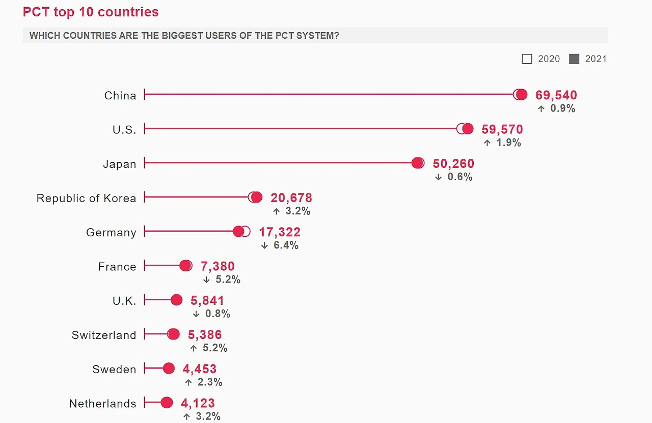 다음, 특허는 'WIPO'에서 알 수 있다. 아래 그림을 보면 한국의 특허순위가 중국, 미국, 일본에 이어 4위라는 사실을 알 수 있다.