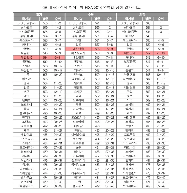 위 팩터 중 가장 중요한 팩터를 고르라면, 당연 '교육'과 '특허'라고 할 수 있다. 먼저, 세계적 교육 수준은 'PISA 순위' 에서 확인할 수 있다. 교육부가 발간한 OECD 국제 학업성취도 평가 연구: PISA 2018 결과 보고서에 따르면, PISA는 대부분의 국가에서 의무교육이 종료되는 시점에 해당하는 만 15세 학생을 대상으로, 인지적 영역 중 핵심 영역인 읽기, 수학, 과학 영역에 대한 소양(literacy), 즉 ‘각 영역의 지식과 기술을 활용하여 다양한 상황에서 문제를 제기하고, 해결하며, 해석함에 있어 효과적으로 분석하고 추론하며 의사소통하는학생의 능력 평가라고 한다. 우리나라의 경우 읽기 영역에서 8위, 수학영역에서 6위, 과학영역에서 7위인 사실을 확인할 수 있다. 굉장히 수준이 높다고 해석할 수 있겠다.