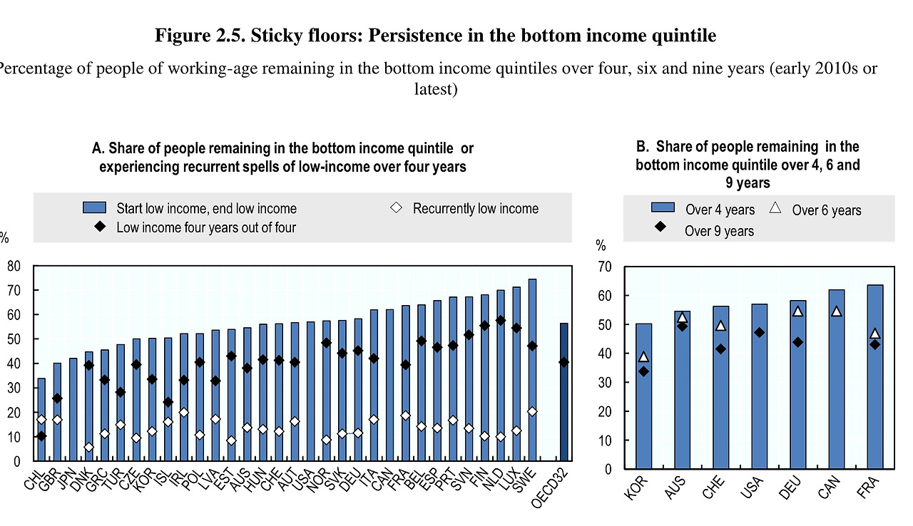 추가적으로 아래 그림은 한국에서 저소득층의 세습 정도를 확인할 수 있다. 한국의 경우, 부모님이 저소득층에 속할 경우 4년 이상 저소득층에 머물 확률이 50%, 6년 이상 40%, 9년 이상 35% 전후로 나타난다.