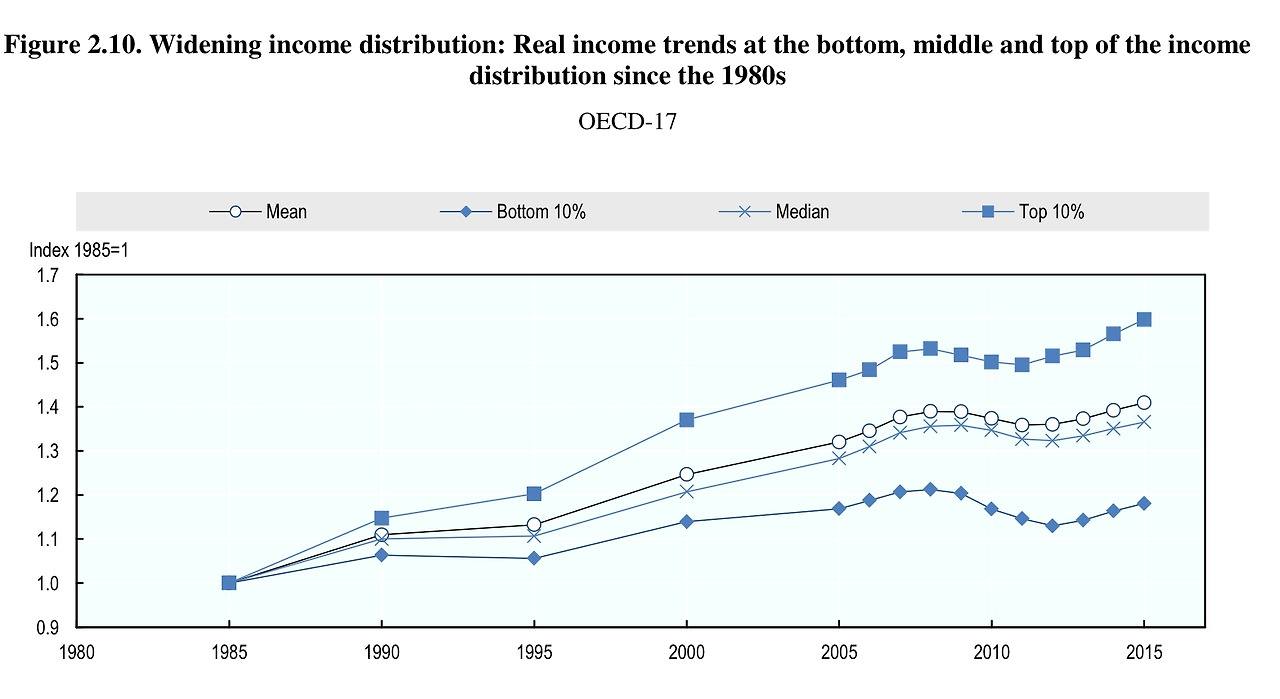 2018년 OECD에서 발표한 『부서진 사회 엘리베이터? 사회적 이동성을 촉진시키는 방법(A Broken Social Elevator? How to Promote Social Mobility)』 보고서에 따르면, OECD 국가의 소득불평등이 심화되었는데, 그 이유는 부의 양극화로 보인다. 1985년의 시작은 동일하지만, 2015년에는 돈이 들어오는 속도가 점차 멀어진다. 이것은 자산의 증가 속도가 소득보다 빠르고, 수십년의 걸친 복리효과로 인한 것으로 보인다.