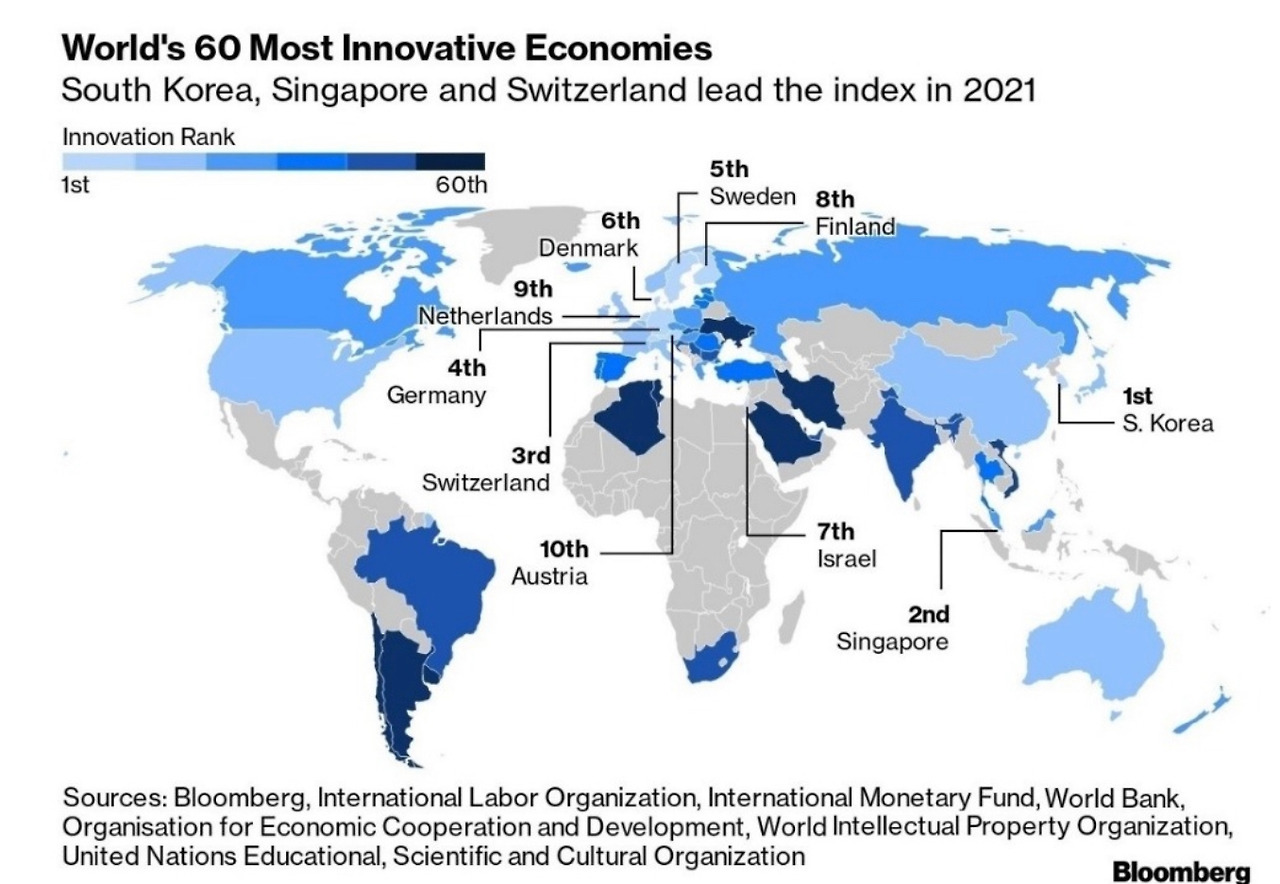 마지막으로 우리나라 기업의 경쟁력은 월드 클래스이다. 아래 그림은 2021년 블룸버그 혁신지수 랭킹으로, 한국이 1위를 차지하고 있다. 블룸버그 혁신지수는 연구개발(R&D) 집중도, 제조업 부가가치, 생산성, 첨단기술 집중도, 연구 집중도, 특허활동, 교육 효율성 총 7개 부문을 종합적으로 판단하여 국가의 혁신력을 측정한다. 특히 특허활동(1위), R&D집중도(2위), 제조업 부가가치(2위), 첨단기술 집중도(4위), 연구 집중도(3위)를 유지하면서 당당히 1위를 차지한 바이다.
