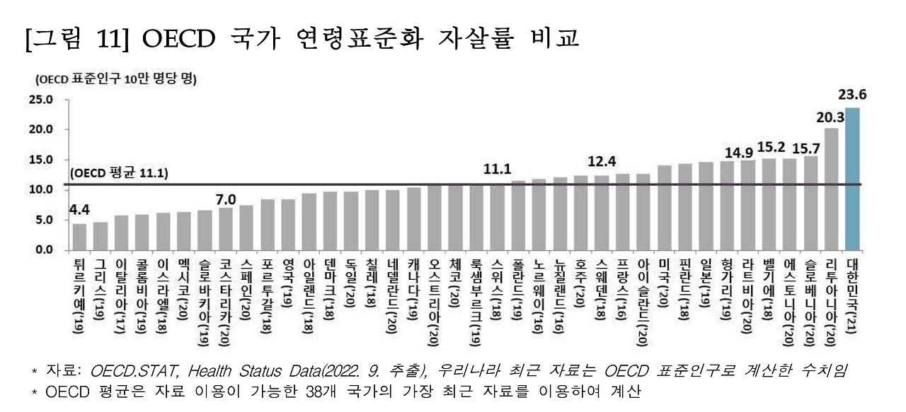 OECD에서 발표한 코로나 위기상황에서의 전신건강조사에 따르면, 2020년 코로나 팬데믹 당시 불안지수가 멕시코, 영국, 미국에 이어 한국이 4위에 포진되어 있다. 우울증 지수는 더 심각하다. 불안 지수와 마찬가지로, 한국이 1위를 차지한다. 즉, 우리나라 사람들은 한국 살면서 행복하지 않다고 느끼고 있다는 것이다.