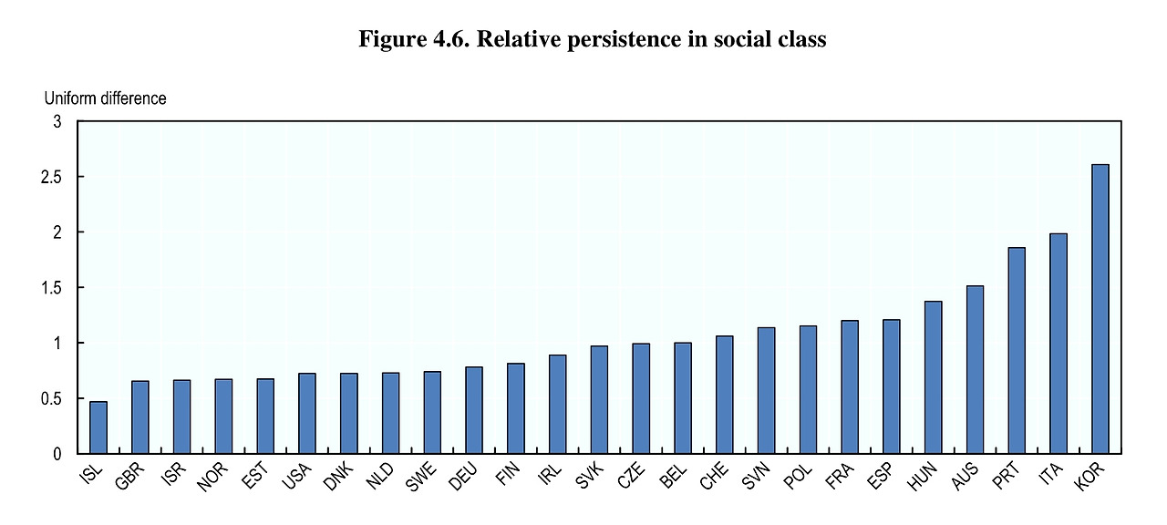 한 가지 더 흥미로운 것은 한국은 사회 계층 이동이 가장 경직된 국가라는 점이다. 아래 그림을 보면, 계층이동(사회이동)은 다양한 측면을 포괄하는 측면을 고려할 때, 한국은 부모의 소득, 직업, 건강 및 교육수준에 따라 자녀의 삶이 절대적으로 영향을 받고 있는 상황임을 보여준다.
