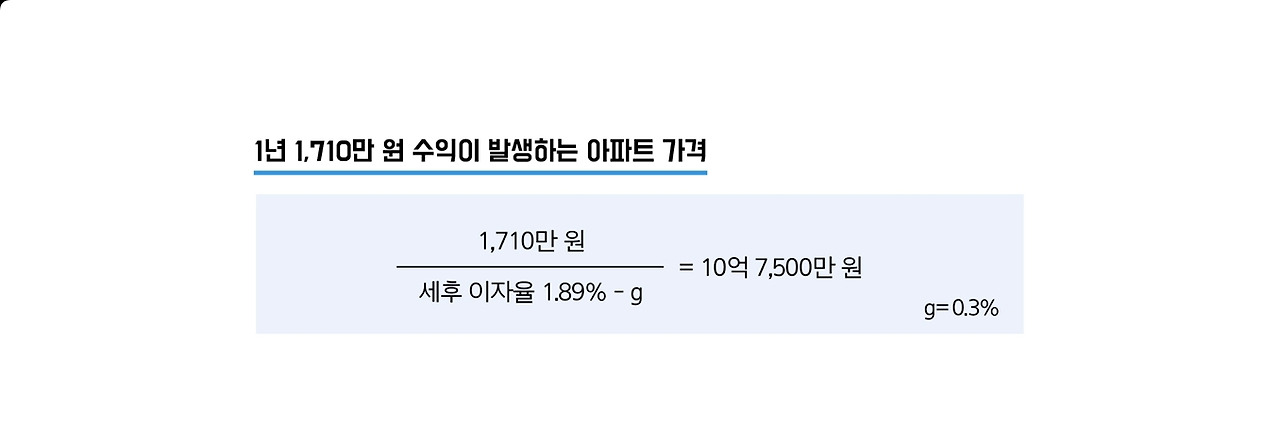 즉, 현금 흐름 양을 기준으로 기준으로 볼 때, 4억 4000만원 - 3억 2645만원 = 1억 1355만원으로 아파트가 비싸다고 평가할 수 있다.