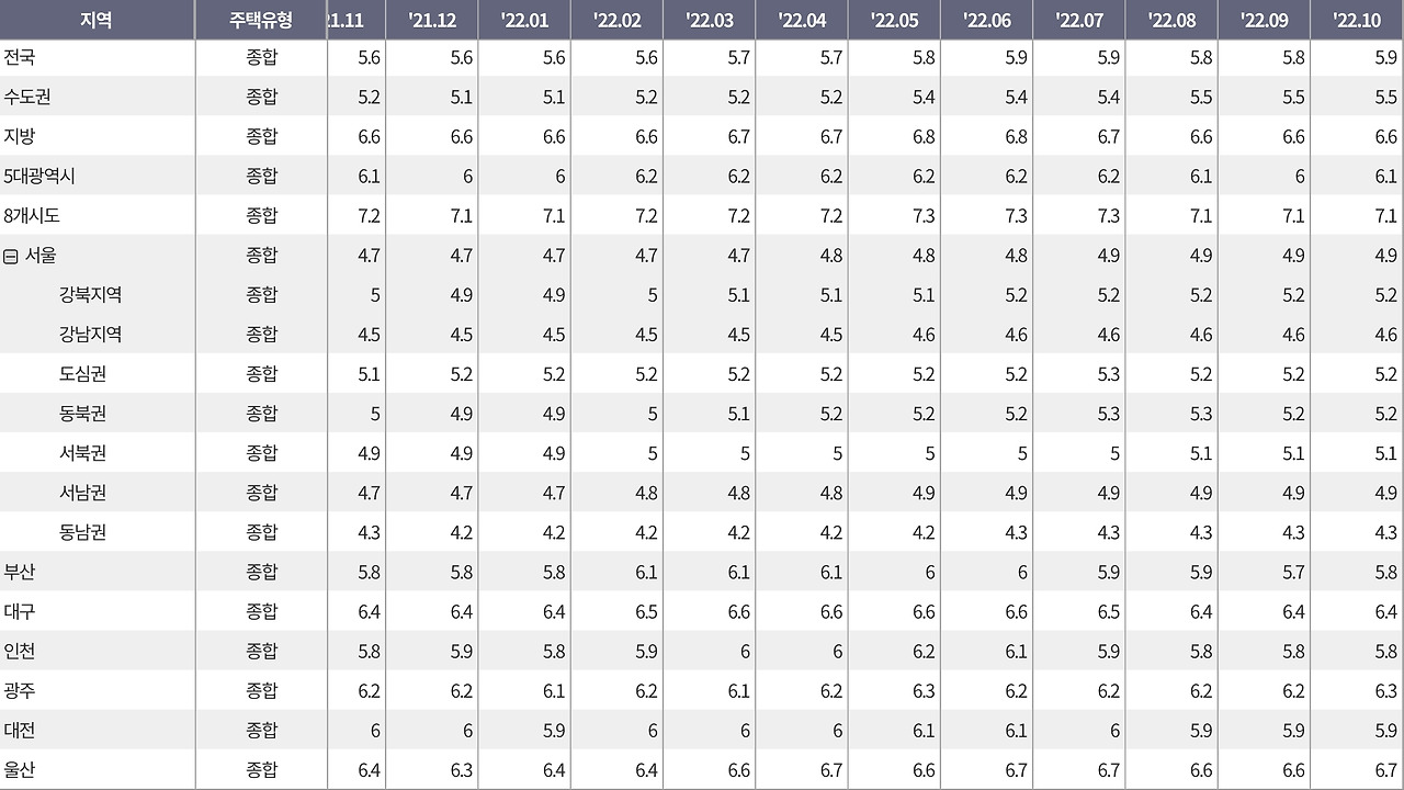 나는 부산에 살고 있으므로 전월세 전환율은 22년 10월 기준 5.8%로 확인된다.