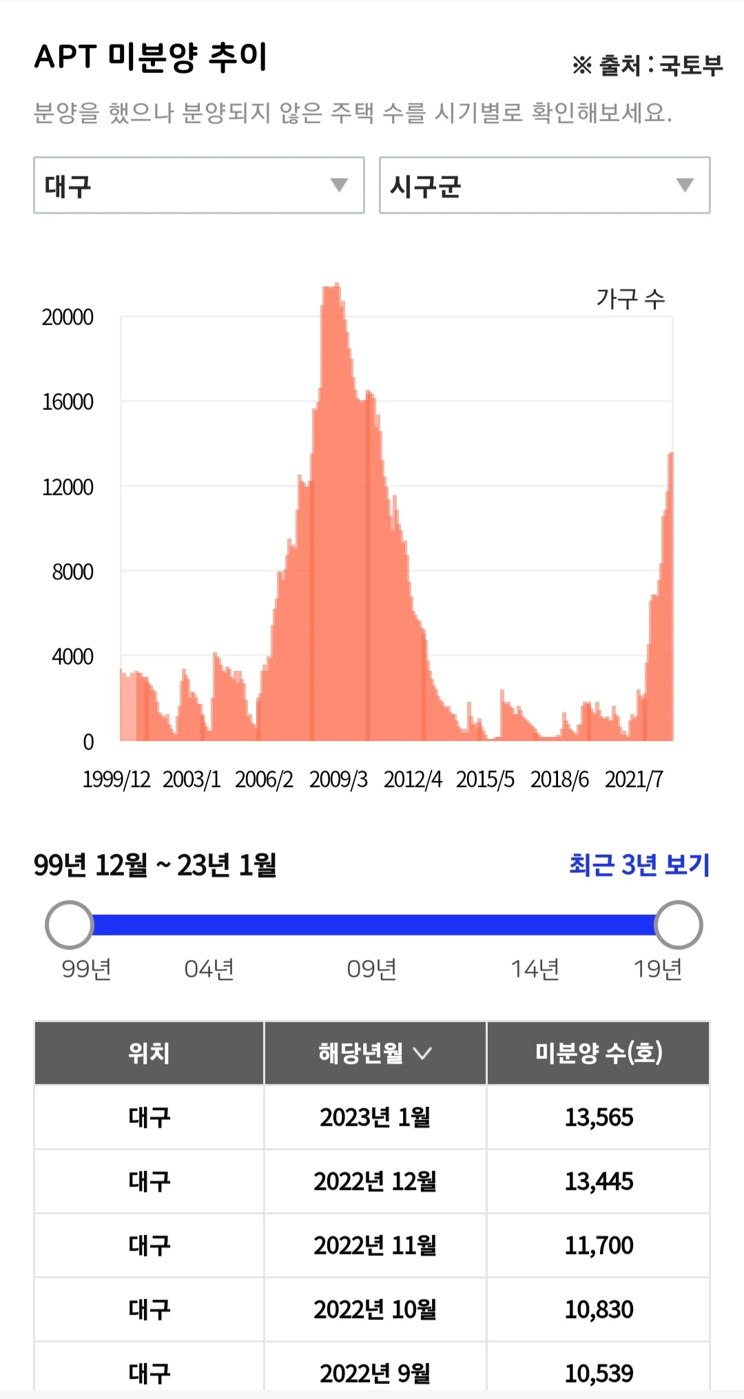 현재 대구의 미분양주택수는 13,565호로, 2006 ~ 2012년까지 진행되어온 미분양주택수 다음으로 가장 많다.