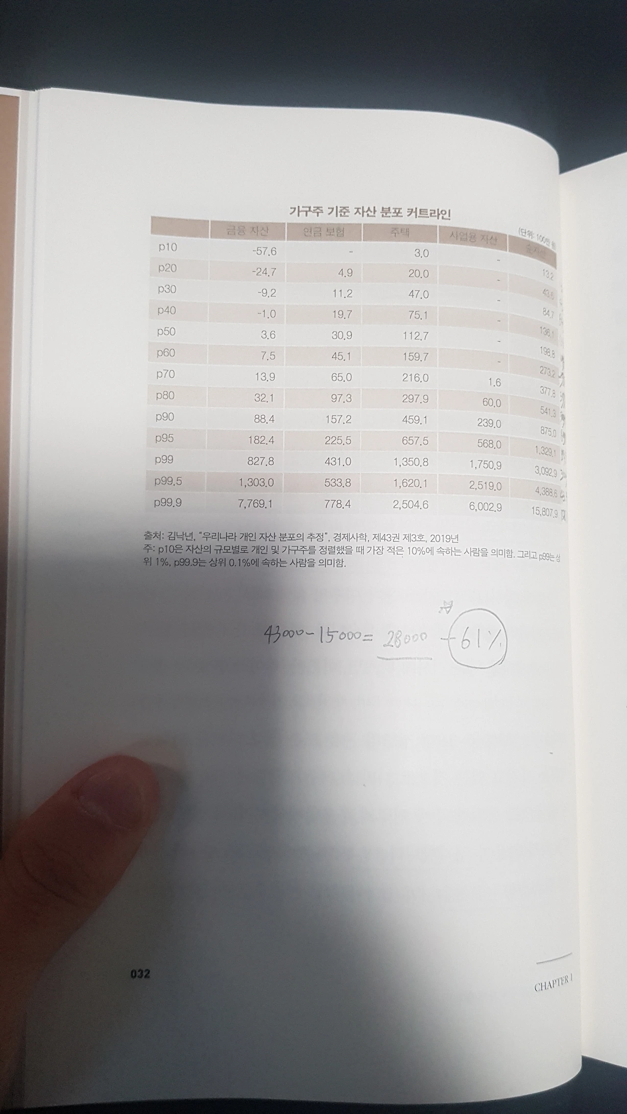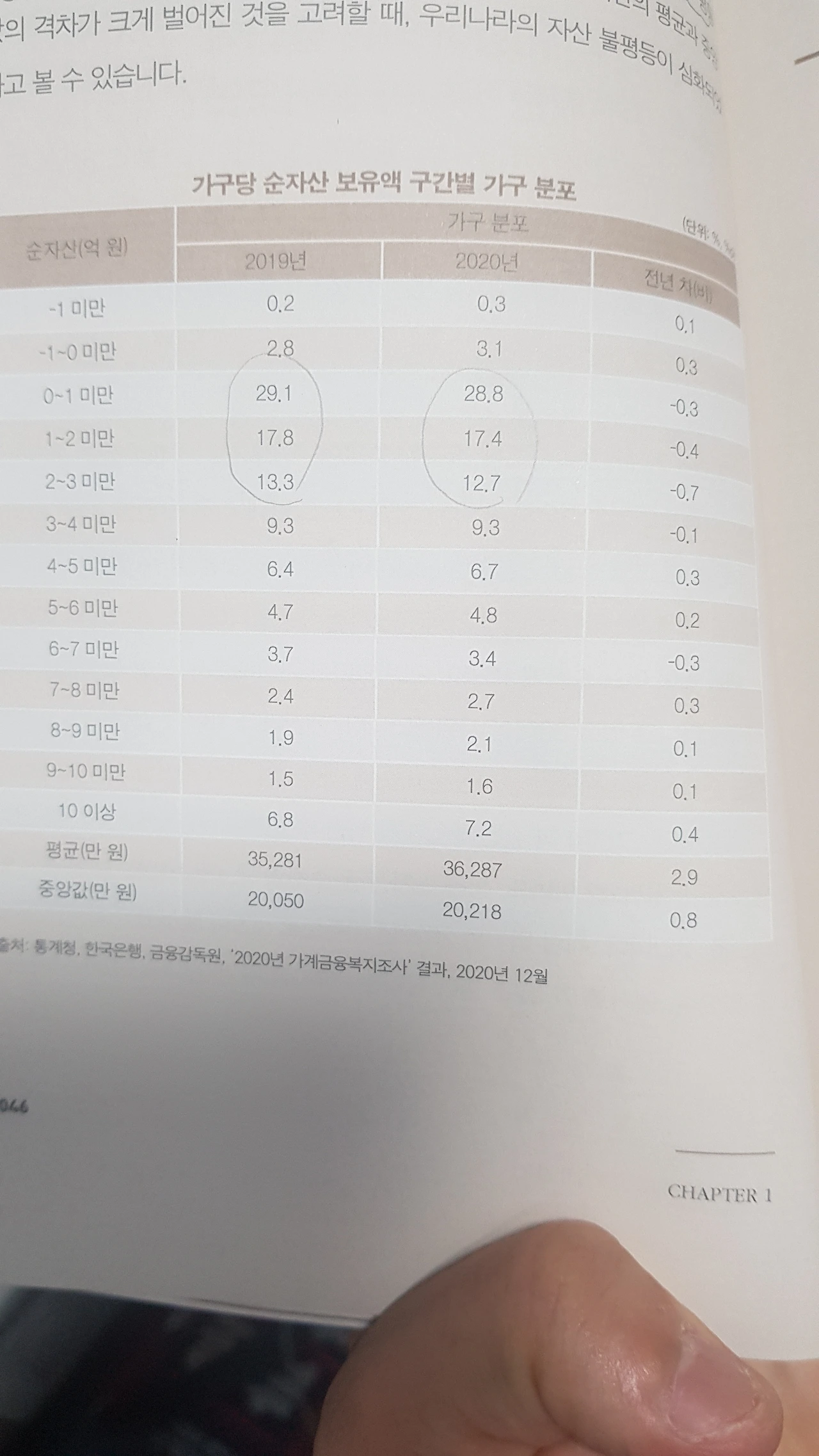 2020년 가계금융복지 조사에 따르면, 가계 순자산에서 부동산이 차지하는 비중이 80%에 이른다 … 부유층 자산 소유 현황에 따르면, 한국의 가구주 기준 상위 10% 순자산은 8억 8000만 원이며, 상위 5%는 13억 3000만 원이다. 따라서 상위 1% 가구주가 되려면 최소 30억 9000만 원, 상위 0.5%가 되려면 49억 9000만 원, 상위 0.1%가 되려면 158억 1000만 원이 있어야 한다. … 한편, 우리나라 가계의 평균 순자산은 3억 6000만 원이고, 중앙값은 2억이다.
