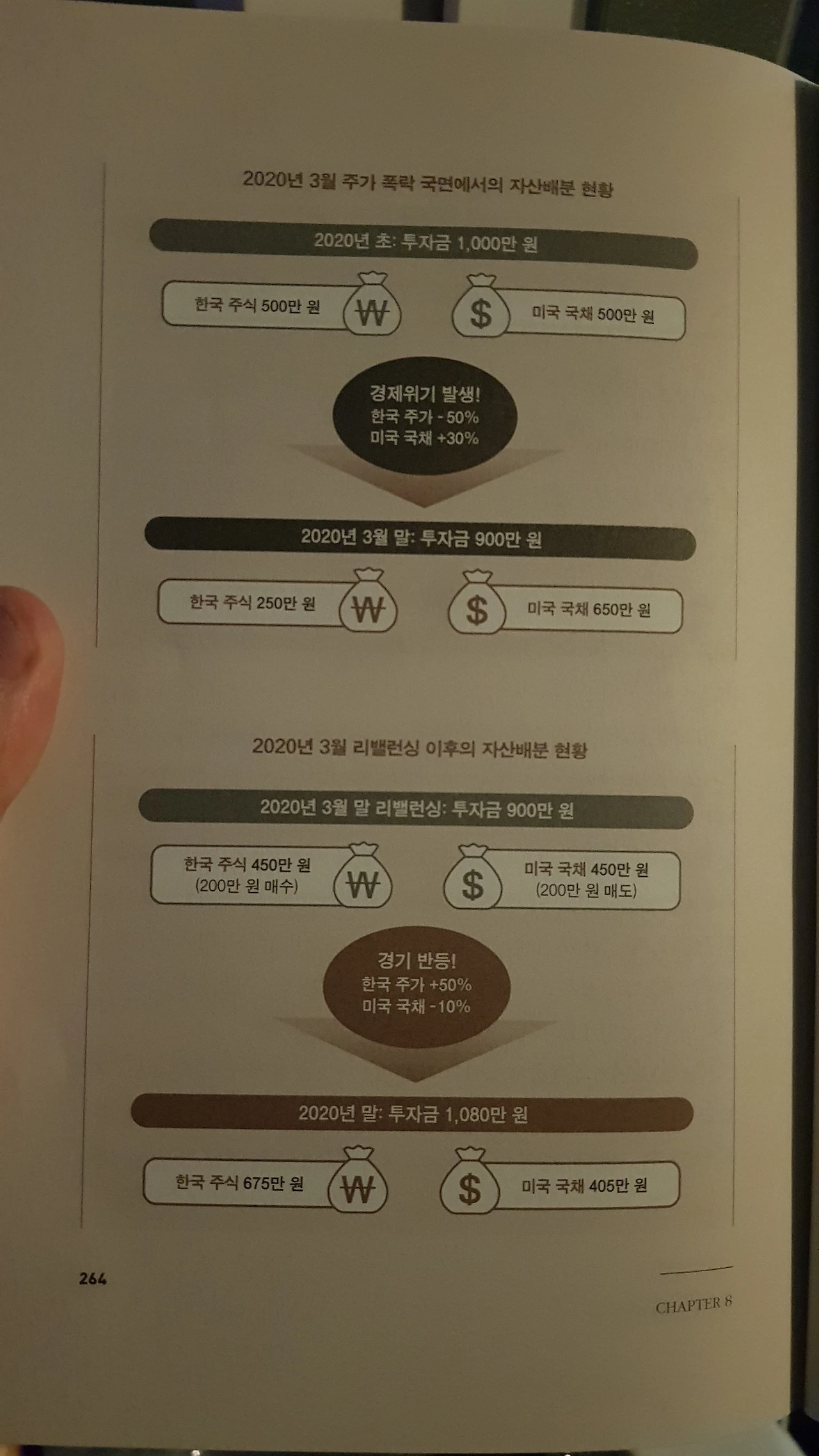 둘째, 자산배분 전략과 함께 리밸런싱이 반드시 병행되어야 한다. 환율이 급등하고 주가가 폭락할 때, 저평가된 주식에 올인하는 것은 좋지 않다. 이때 필요한 것이 투자 원칙이다. 투자 원칙이 바로’ 자산배분’에 따른 ‘리밸런싱’이라고 할 수 있다. 저자 홍춘욱 박사님은 자산배분과 리밸런싱에 관해 ‘국민연금 스타일의 자산배분 전략’이라고 명명하면서 그 방법을 다음과 같이 제시한다.