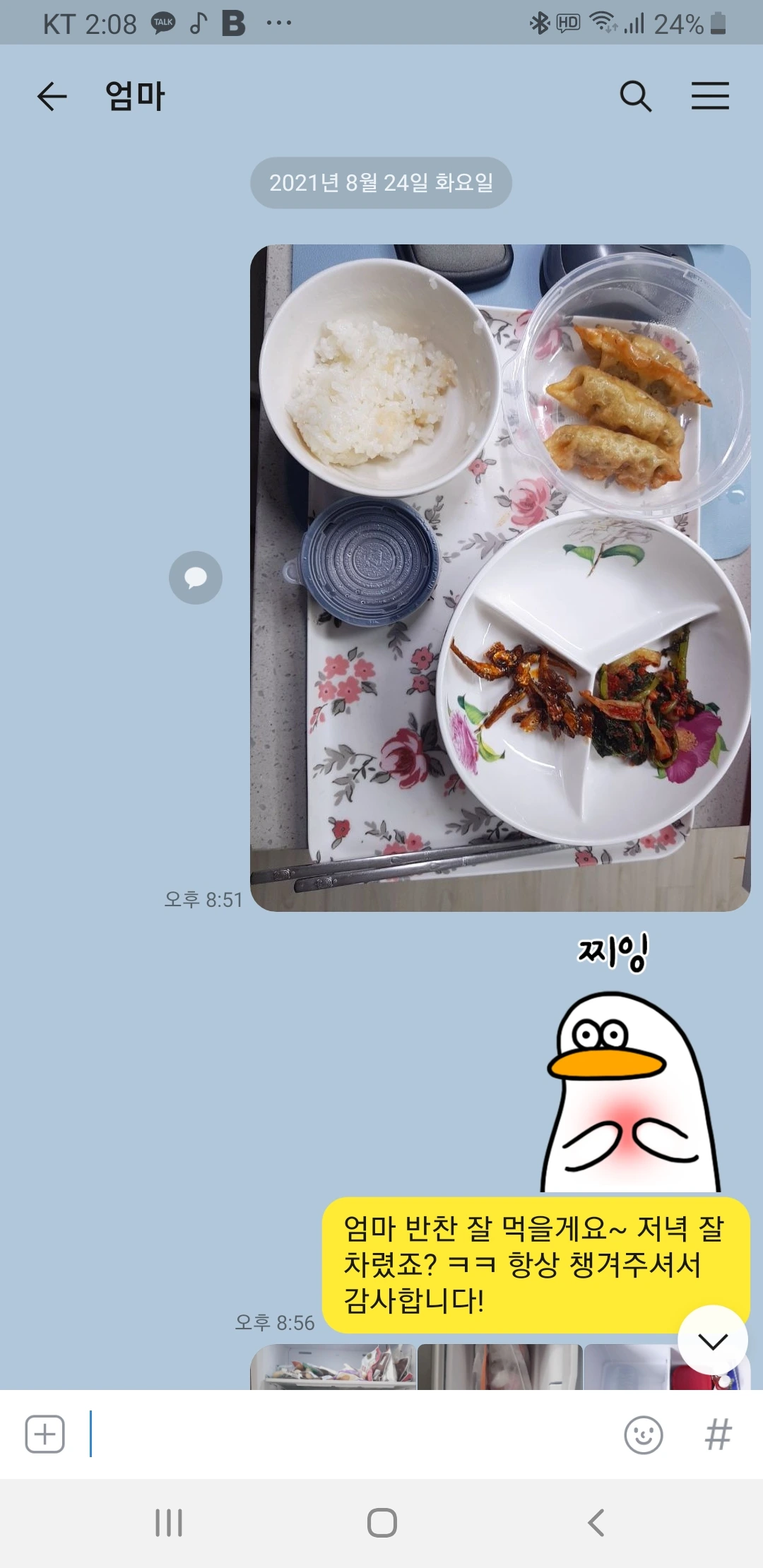 어머니가 반찬을 싸왔을 때 나의 첫 반응은 "음식물 쓰레기 나온다", "집에 있는 시간도 많이 없는데 싸오지 말지"라고 말했다. 근데 어머니가 귀가하고 저녁이 되니, 반찬을 가지고 저녁을 먹고 있는 내 모습을 보고 서운한 말을 들은 어머니한테 엄청 미안했다. 그래서 카카오톡으로 문자를 보냈다. 잘 먹었다고, 감사하다고. 어머니라면 누구나 자식이 자취를 시작하면서 노심초사하지 않을까? 적어도 우리 어머니는 그런 것 같다.