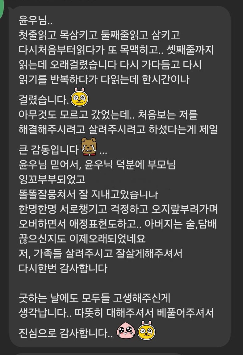 손님 A는 대략 일 년간 기도를 먼저 올렸다. 나는 굿할 때 돈 적게 받지 않는다. 필요한 만큼 정확히 돈 받고, 확실히 고친다는 주의라서 한 번 굿 잡으면 몇 달씩 그 손님한테만 매달리니 돈 적게 받을 수 없다. 큰 굿 값 때문에 A는 기도 먼저 올렸다. 기도는 일 년 단위로 받는다. A의 증세를 말끔히 고칠 수는 없지만 더 심화되지 않게 막는 힘이 있다.
