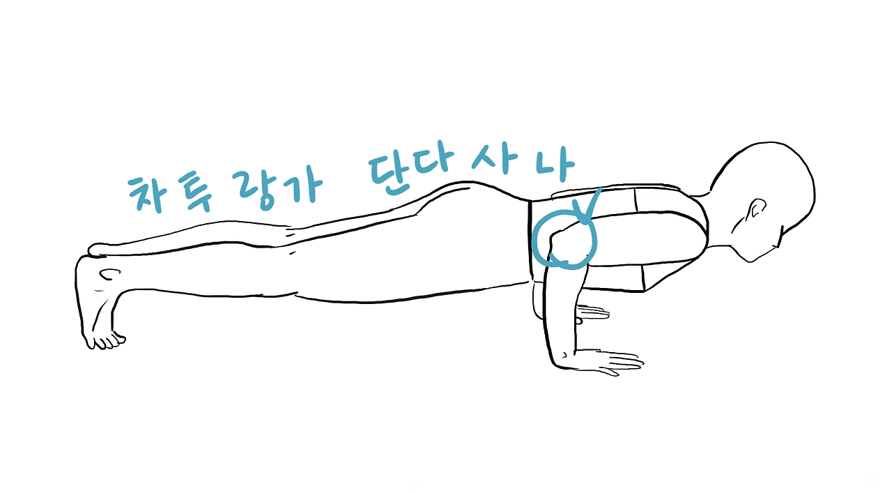 일반적인 푸시업은 팔의 너비가 어깨너비 보다 조금 더 넓은 반면, 차투랑가는 팔꿈치를 옆구리 쪽에 딱 붙이는 느낌이다. 전엔 이 차투랑가를 할 때 1-2초 사이에 매가리 없이 바닥으로 고꾸라지곤 했다. 그런데 이게 웬걸? 이젠 안정적인 코어를 바탕으로 천천히 무게를 버티며 내려갈 수 있다.