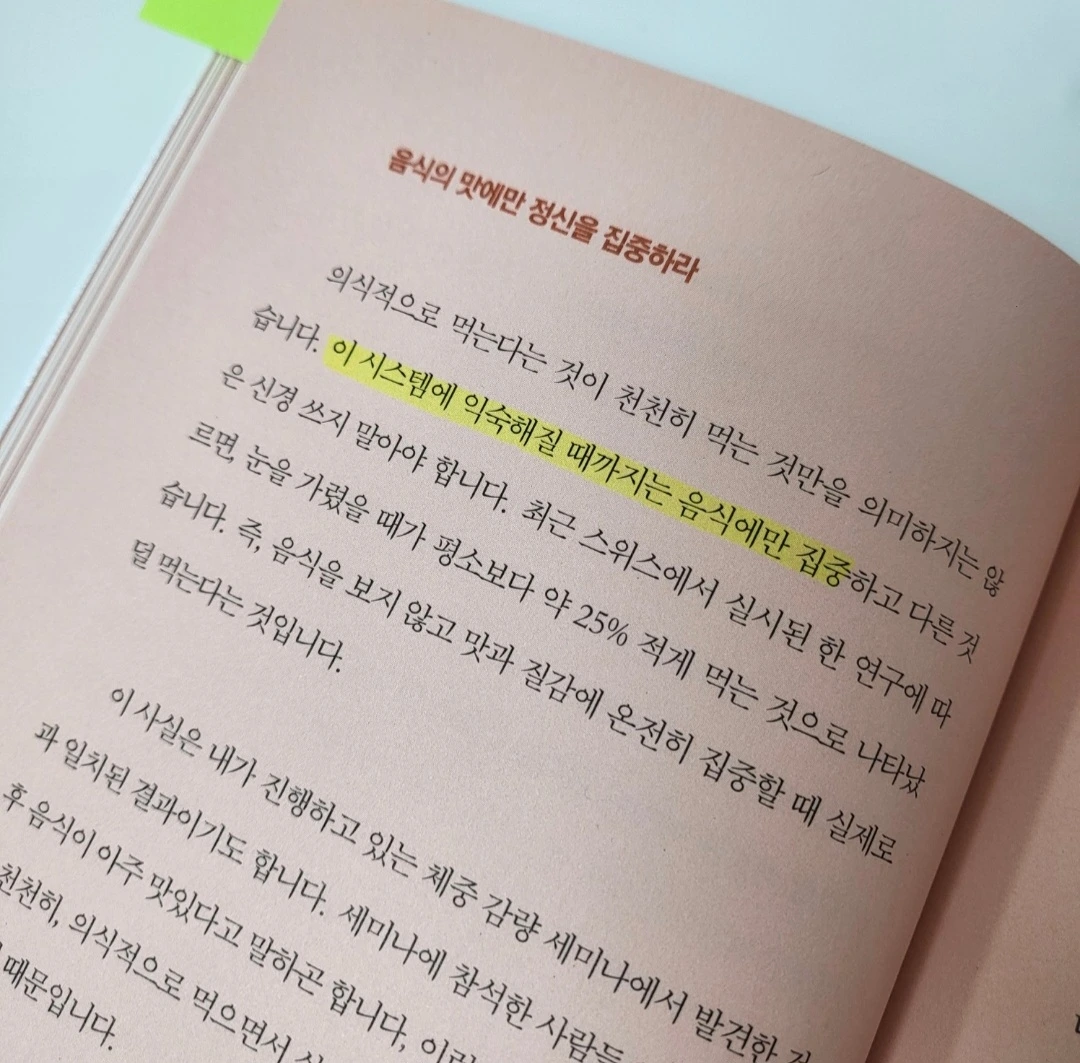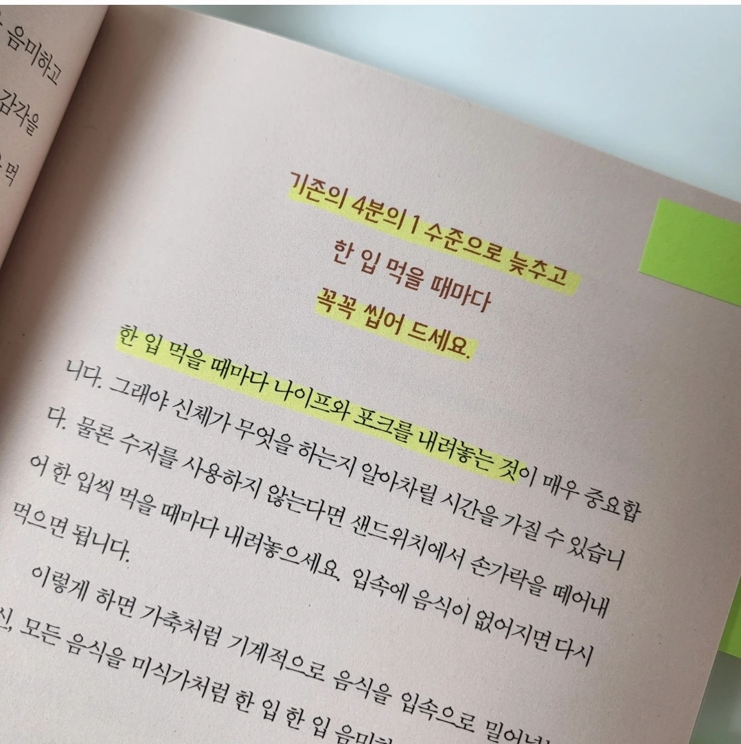 책에서는 2주 간 식사 속도를 기존 대비 4배 느리게 먹어보라고 하는데, 그러면 거진 1시간 동안 먹어야 한다. 시작치고는 너무 가혹하니까 일단 2배 정도 느린 30분을 목표로 꼭꼭 씹어가며 먹어봐야겠다.