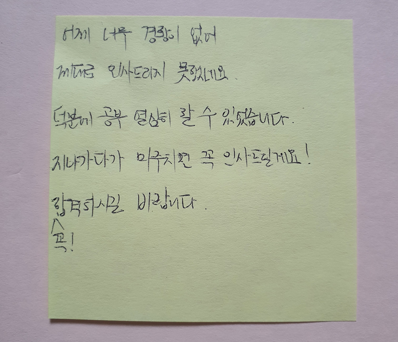 그렇게 시험은 끝이 났다. 며칠 뒤 자리를 정리하러 오랜만에 열람실에 들렀는데, 책상 한 켠에 붙어있는 노란 메모지가 눈에 들어왔다.
