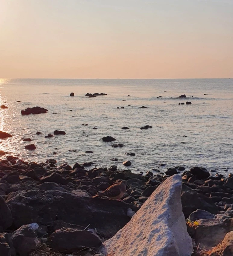 동이 트자 눈썹달은 수평선 너머로 졌다. 언제나처럼 바닷가에는 새 지저귀는 소리가 가득했다. 그 중에서 가장 친숙한 새는 역시 비둘기다. 멧비둘기는 한국의 토종 비둘기라고 한다. 얼룩무늬가 매력적이고 도시에서 흔히 보이는 회색 비둘기보다 덩치가 다소 작아보인다. 아침 운동을 하며, 장을 보러 가며 멧비둘기들을 한참 쫓아다녔는데 도시 비둘기들과 달리 조금만 다가가면 날아가버리는 경계심과 자유로움, 가벼움을 유지하고 있다. 겨우겨우 아주 가까이에서 멧비둘기를 살필 기회를 얻었다. 멀리서 보면 바위와 혼동될 것 같다. 바다 위에서 새들은 어두운 점처럼 잘 보인다. 하지만 바닷가의 검은 바위는 새들의 안식처가 되어주고 그들이 은신할 수 있는 배경도 되어주나보다. 멧비둘기의 어두운 얼룩무늬는 현무암 위에서 일종의 보호색으로 기능한다.
