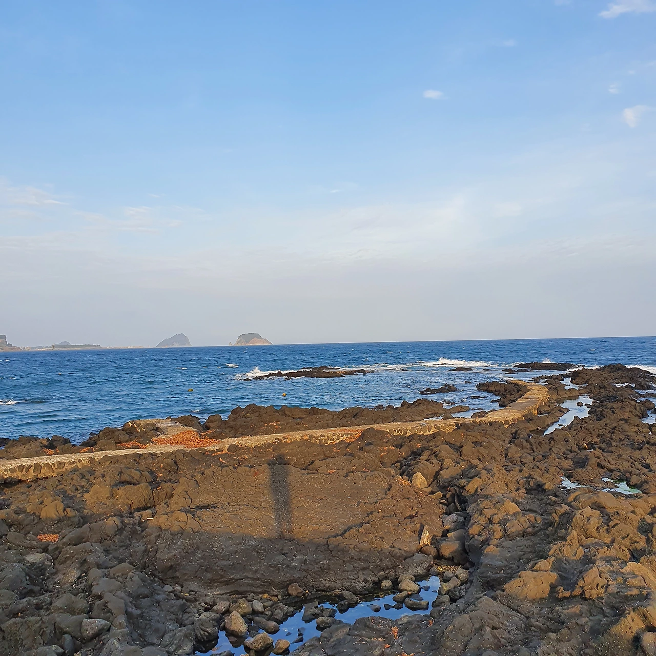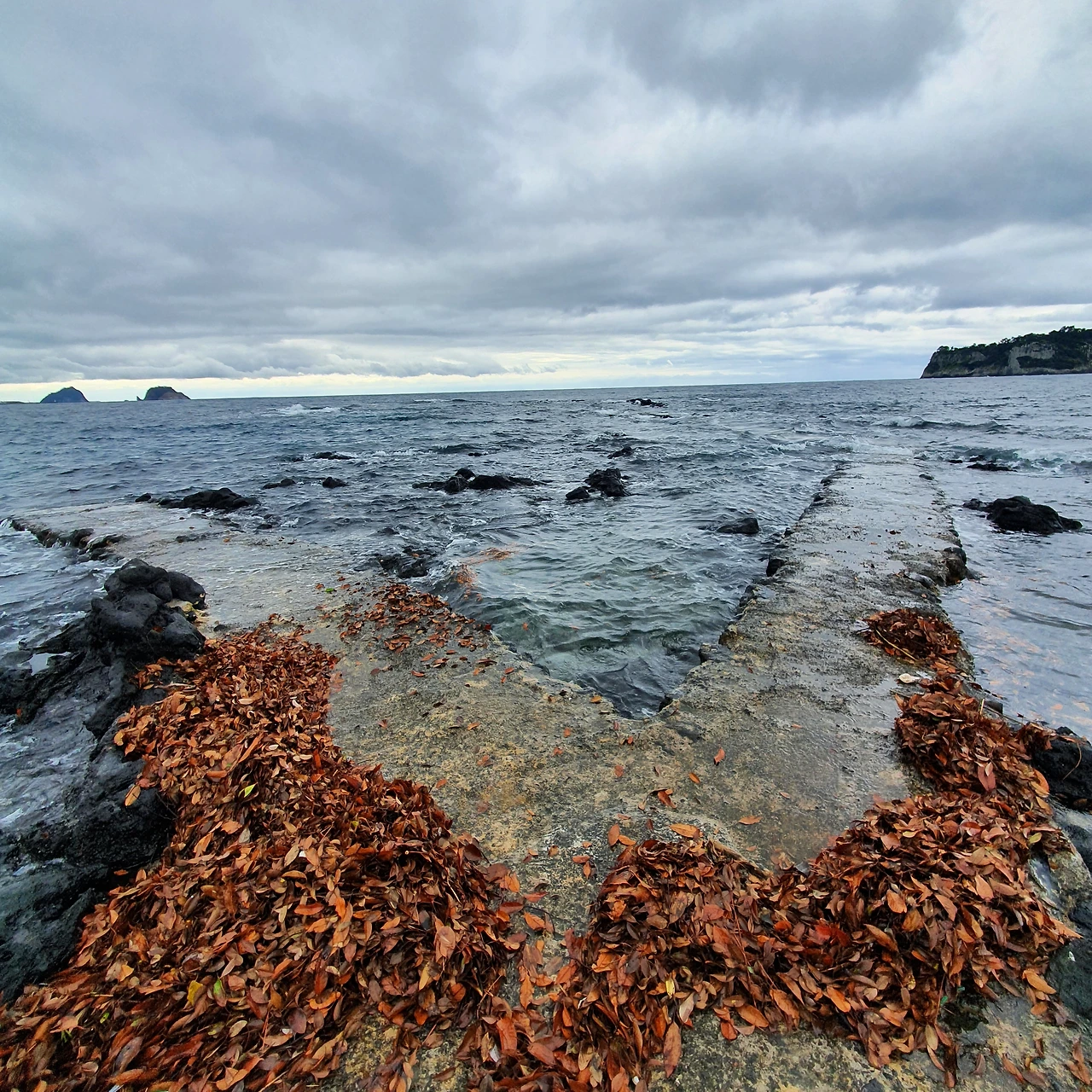 인사도 다 드렸고 정리도 마쳤고 여유 있게 걸을 시간도 남겼다. 축복처럼 내가 가장 좋아했던 풍경들을 다 볼 수 있었다. 어제는 맑았고 밤에도 파도가 높았다. 바다가 살아 숨 쉰다는 증거가 해안에 가득했고 지금은 오늘의 만조다. 빗소리를 들으며 눈을 뜨고 비가 그친 직후의 거친 바다를 보며 떠날 수 있다니. 범섬은 맑은 날보다 흐린 날 빛무리가 적어 더 선명한데, 덕분에 선명한 바위섬들과 수평선도 보고 있다.