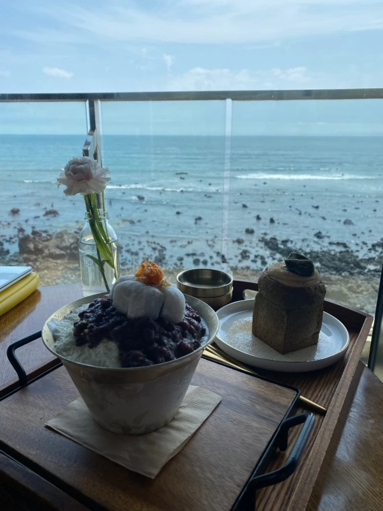 여기 와서 첫 경험을 많이 하고 있다. 오늘은 태어나 처음으로 디저트를 먹고 '너무' 맛있다는 말의 의미를 통감했다. 왜 우리가 좋은 일에 '너무'라는 부정적 의미의 부사를 쓰는지 의아했는데 과할 정도로 맛있는 음식을 먹으니 알 것 같았다. 이 맛을 잊고 싶지가 않고 서울로 돌아가면 먹을 수 없다는 사실이 아쉬울 정도였다. 그야말로 '너무' 맛있어서 기쁘고도 울적했다. 카페는 예뻤고 위치도 좋았고 창밖으로는 머리가 구름에 가려 현묘한 분위기를 내는 섶섬과 아름다운 바다가 보였다.