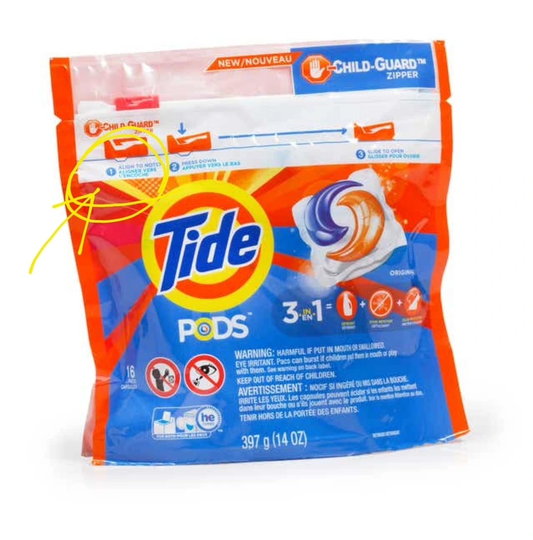 표백세제에 Allign to notch 라는 말이 써있는데, Notch가 뭔가 그림과 맞춰보면 맨위에 있는 우리말로 하면 뭐라고 해야 할까... 파우치를 열기 위한 네모난 부분에 살짝 들어간 부분을 뜻한다는 것을 어렴풋이 이해할 수 있다.