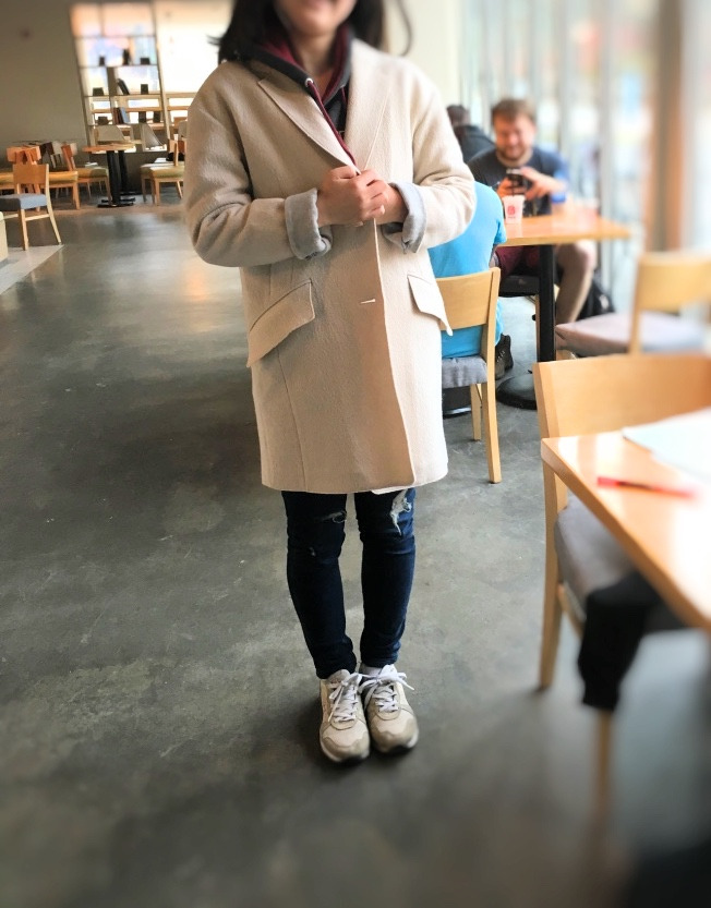 한 쇼핑몰에서 만난 그녀. 아이보리 스웨터와 오버 핏 아이보리 코트를 입고 있었다. 그간의 이야기를 들어 보았다.