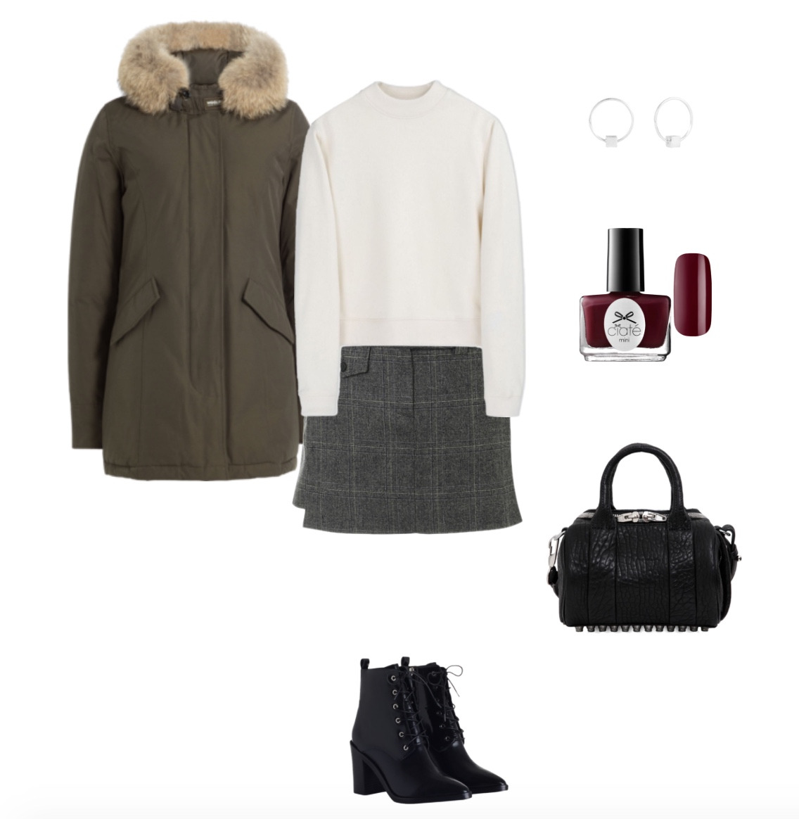 이제 외투 안에 입을 하의와 상의를 결정할 차례. ‘신경 썼다’ + ‘불편하다’의 주범이 되었던 그녀의 타이트한 미니스커트를 대체할 것으로 A라인 미니스커트를 쇼핑리스트에 포함시켰다. 밀리터리 재킷에 헤링본 소재의 A라인 스커트를 매치하는 거다. 그러면 헤링본 패턴의 중후함과 스커트의 여성스러움이 아우터의 분위기와 대비되어 정말 스타일리시할 것이다.