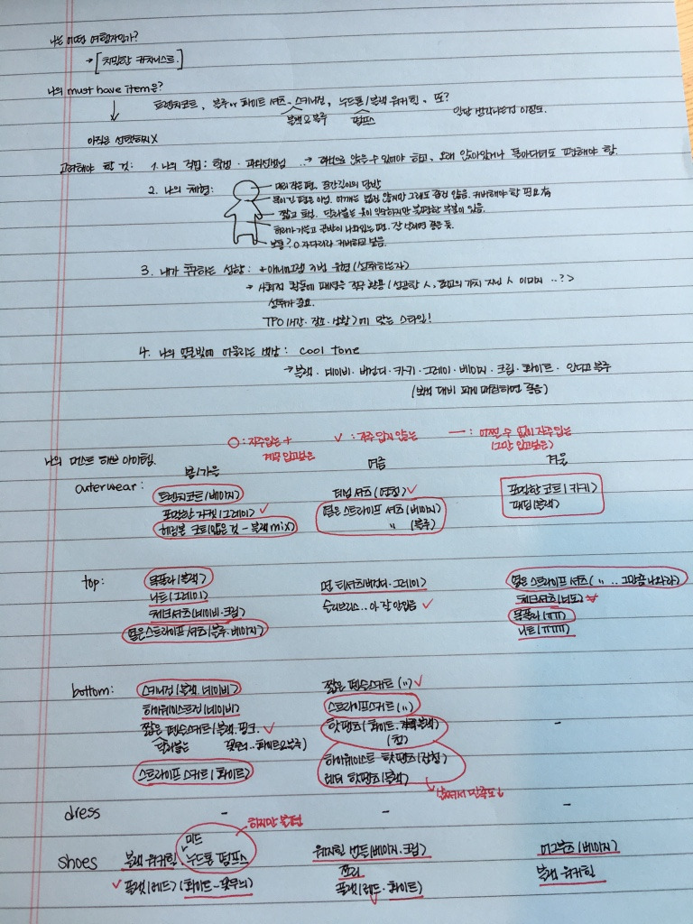 그녀를 위해 2가지 겨울 룩을 짜기로 했다. 본격적으로 작업을 시작하려는데, 웬걸. 그녀의 노트에 나는 경악했다. 그 노트엔 옷장에서 ‘입는 옷’과 ‘입지 않는 옷’에 대한 빽빽한 분석이 작고 예쁜 글씨로 새겨져 있었다. 크! 치밀하다.