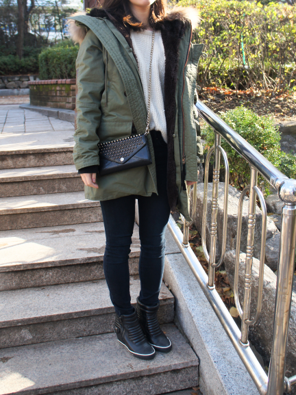 그리고 심플한 아이보리 코트와 카키색 밀리터리 재킷에 에지를 더해줄 하의가 필요했다. 나는 버건디색 스키니진을 제안했다. 버건디 색은 우리가 사기로 한, 두 가지 아우터 모두와 색상 매치가 조화롭다. 뿐만 아니라 색상 자체의 강렬함 때문에, 화려한 디테일이 없어도 그녀의 ‘화려함’ 욕구를 충족시켜줄 수 있다. 게다가 스키니진의 타이트한 핏과 아우터의 헐렁한 핏이 대비되면 조화로울 수밖에!