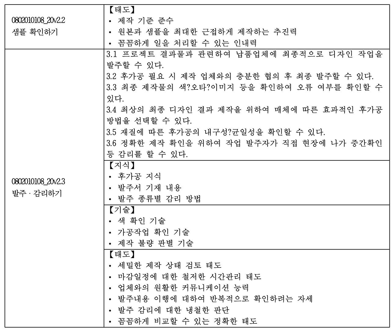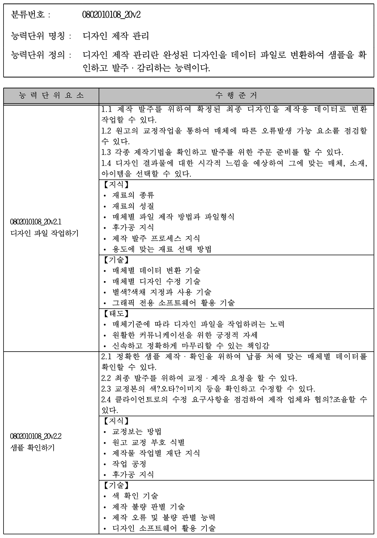 시각디자인 직무자인 자신에게 물어본다. 나는 디자인 능력구분 중 디자인 제작관리 능력이 어느 수준인가? 단순히 시각적 미감이 우수한 수준의 시안을 만들어내는 것은 디자이너 능력 중 극히 일부분에 지나지 않는다. 올바른 데이터로 제작할 수 있어야 하며, 꼼꼼한 교정능력과 기법에 대한 이론지식 또한 갖추고 있어야 한다. 산업군에 따라 필요로 하는 재료에 대한 이해와 성질, 후가공지 식 또한 있어야 한다. 능력단위마다 필요한 태도까지 정리되어 있어 읽다 보면 내가 이 직군을 얼마나 얕잡아봤길래 말도 안 되는 걱정을 했나 싶고, 또 나 자신에게서 부족한 지식이나 기술, 또는 태도에 대해 점검할 수 있게 된다.