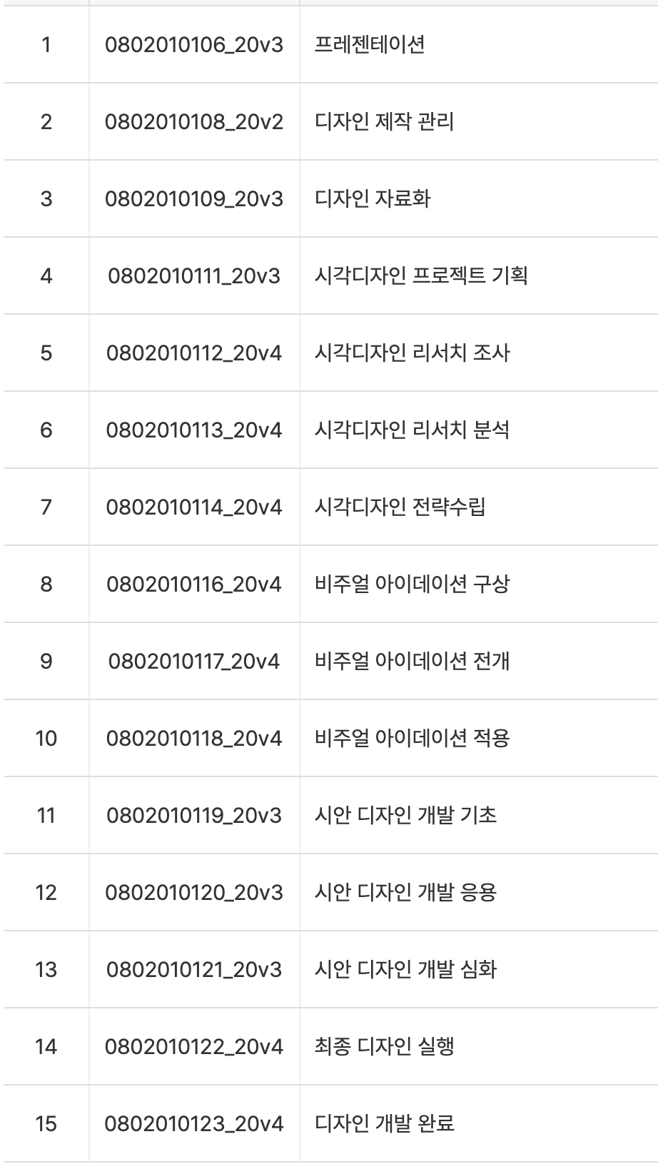 '시각디자인'이라는 용어는 때론 너무 포괄적으로 들려 쓰기 어색할 때도 있지만 국내 NCS기준으로 중단 위 직무명에 속한다. 그리고 능력단위의 세부 정의를 확인하며 내 직무적 능력치를 판단하며 내 수준을 판단할 수 있다. 자료의 구분과 내용 중 일부는 시대와 맞지 않는 부분이 더러 존재하지만 이를 감안하고 보아도 서류로 내 능력을 국가표준에 맞게 정리할 수 있는 객관적 수단이다.