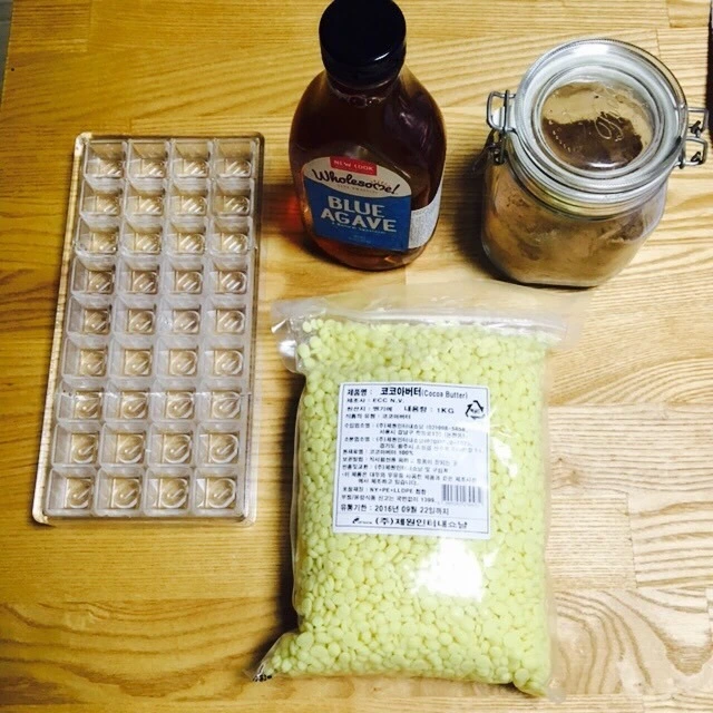 재료 : 카카오 버터 1컵 (200ml) , 카카오가루 1컵, 아가베 시럽 1/2컵 , 초콜릿 몰드