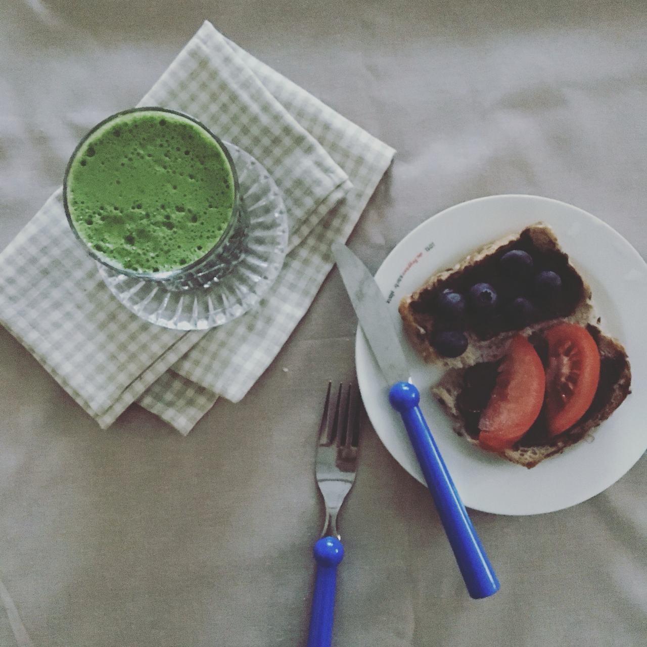 저는 오늘 아침에 당근즙을 마시고 점심엔 일반식을, 오후에 간식으로 케일즙과 통밀빵에 아보카도로 만든 초코무스 올려 먹었어요.
