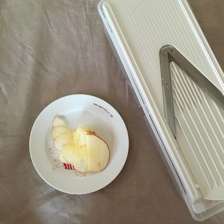 1. V 슬라이서로 사과를 얇게 채 썰어주세요.