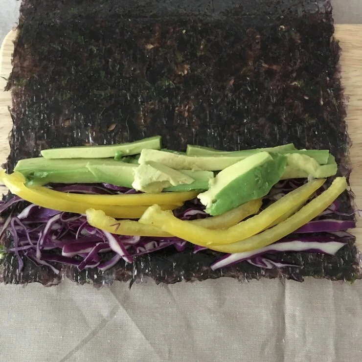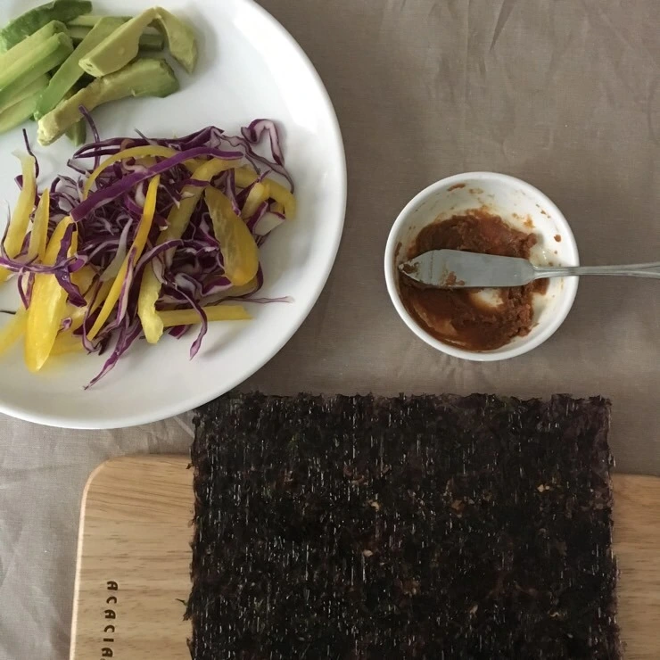 재료(1인분) : 김 한장 , 양배추, 파프리카 적당량, 아보카도 반개 , 미소된장 1/2T , 참기름 조금